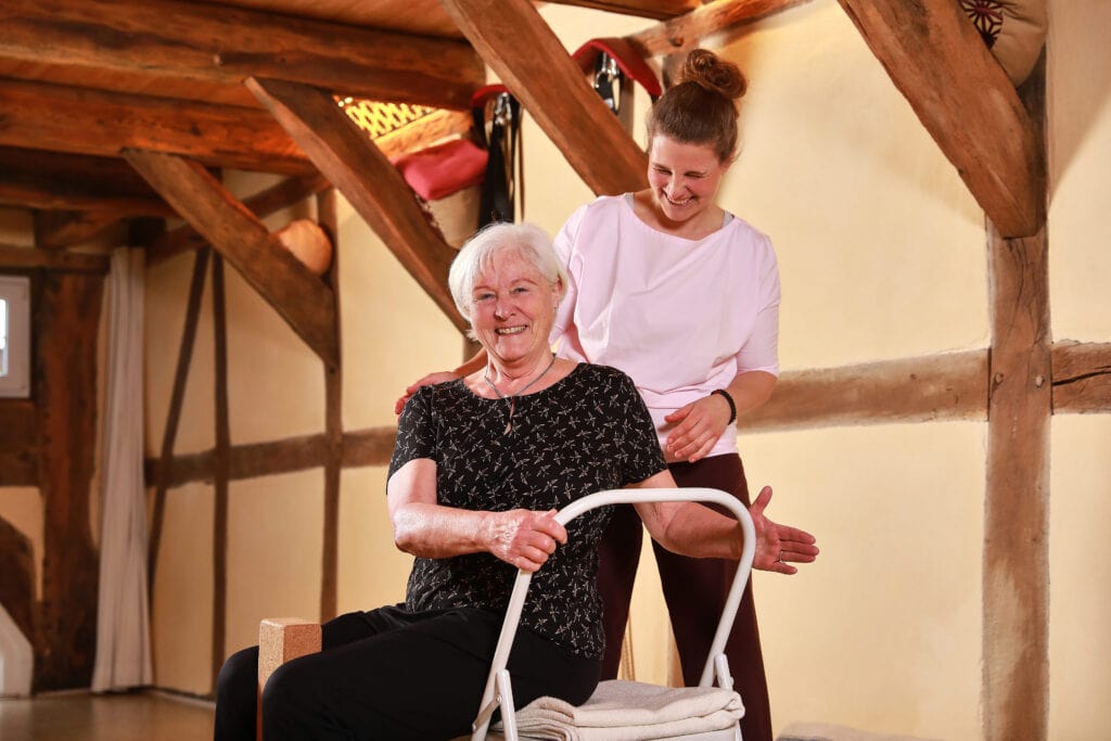 Für alle Übungen gibt es Abwandlungen sowie die Möglichkeit Yoga-Hilfsmittel, wie spezielle Stühle, Klötze, Gurte, Polster oder Decken zu nutzen. So spielen körperliche Einschränkungen oder Konstitution eine untergeordnete Rolle, wodurch ein auf die konkreten Bedürfnisse abgestimmter Zugang zu den hilfreichen Yoga-Übungen ermöglicht werden kann. Der Rahmen einer motivierten Gruppe trägt hier gleichzeitig zum Erfolg bei.
